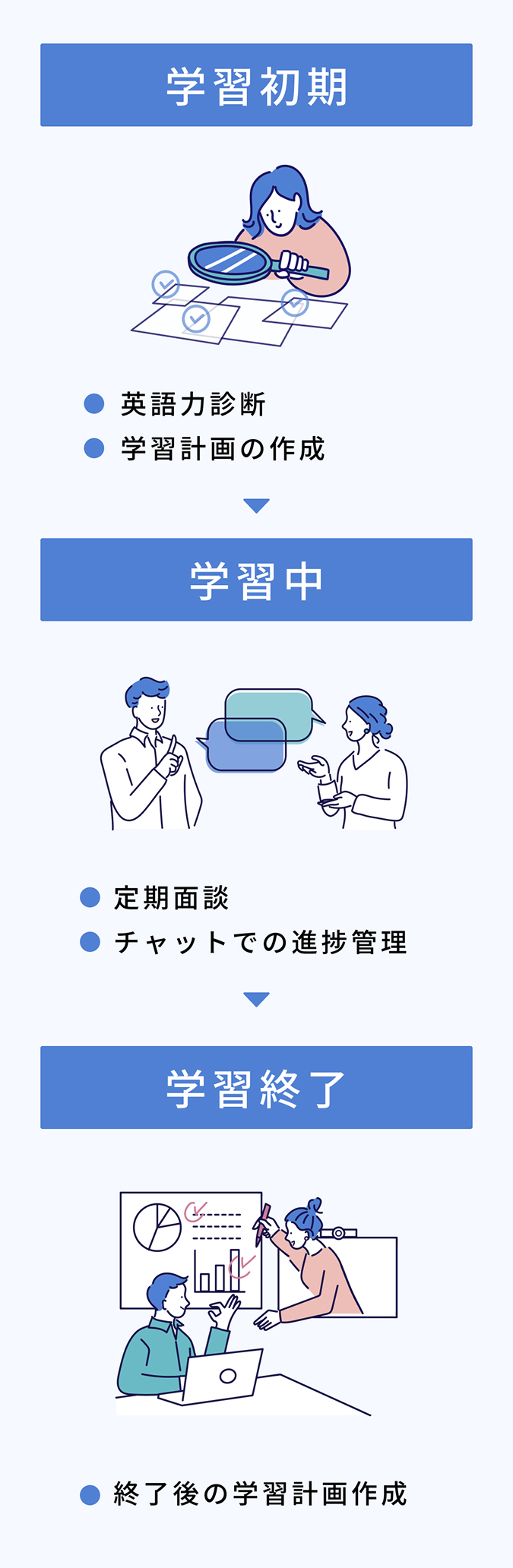 英語コーチの仕事は大きく2つに分けられます。1つは約1週間に1度の定期面談での、生徒の学習管理です。