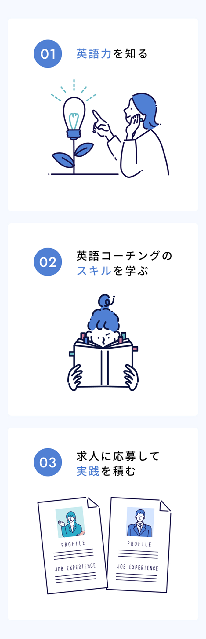 活躍できる英語コーチになるためには大きく分けて3つのSTEPがあります。①自分の英語力を知る ②英語コーチングのスキルを学ぶ ③実践練習を行う。英語コーチには、英語力だけでなく、学習者を導くためのスキルも求められます。そのため、実践を始める前に、英語コーチングの全体像を体系的に学ぶことが大切です。また、英語コーチとして活動する準備として、自分の現在の英語力を把握しておくことも重要です。TOEICなどの資格試験を受講しておくと、自分が提供できる英語コーチングの方向性を明確にできます。