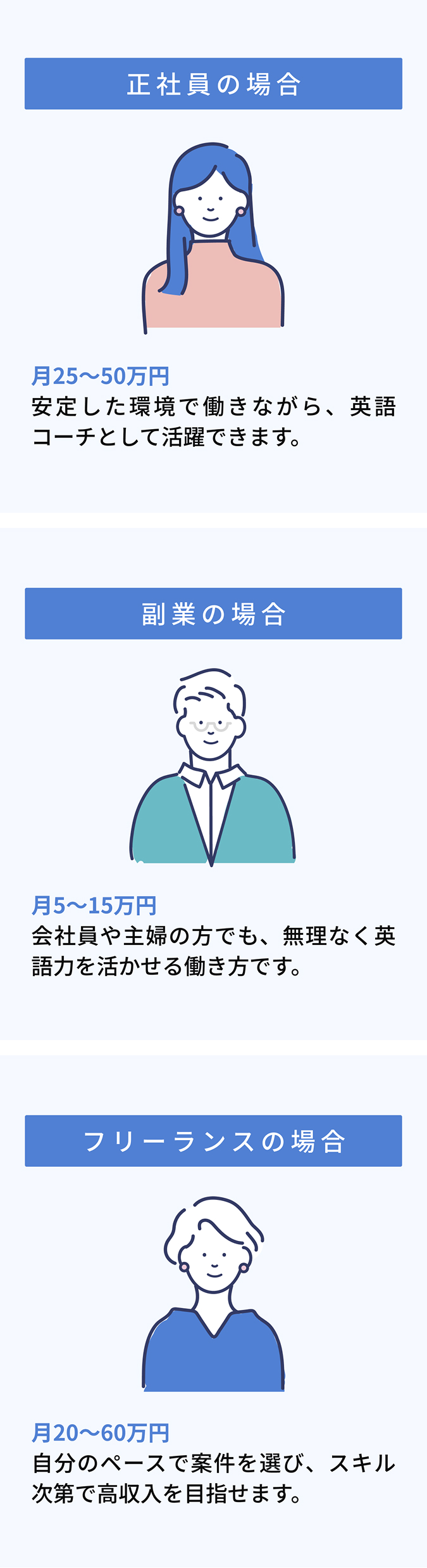 英語コーチの働き方別の収入モデルをご紹介します。正社員としてスクールに勤務する場合は月給制が一般的で、副業やフリーランスの場合は、担当する生徒数やセッション単価によって収入が大きく変動します。副業・フリーランスでは、経験やスキルを重ねることで単価を上げたり、継続契約を増やすことで安定した収入を得ることも可能です。