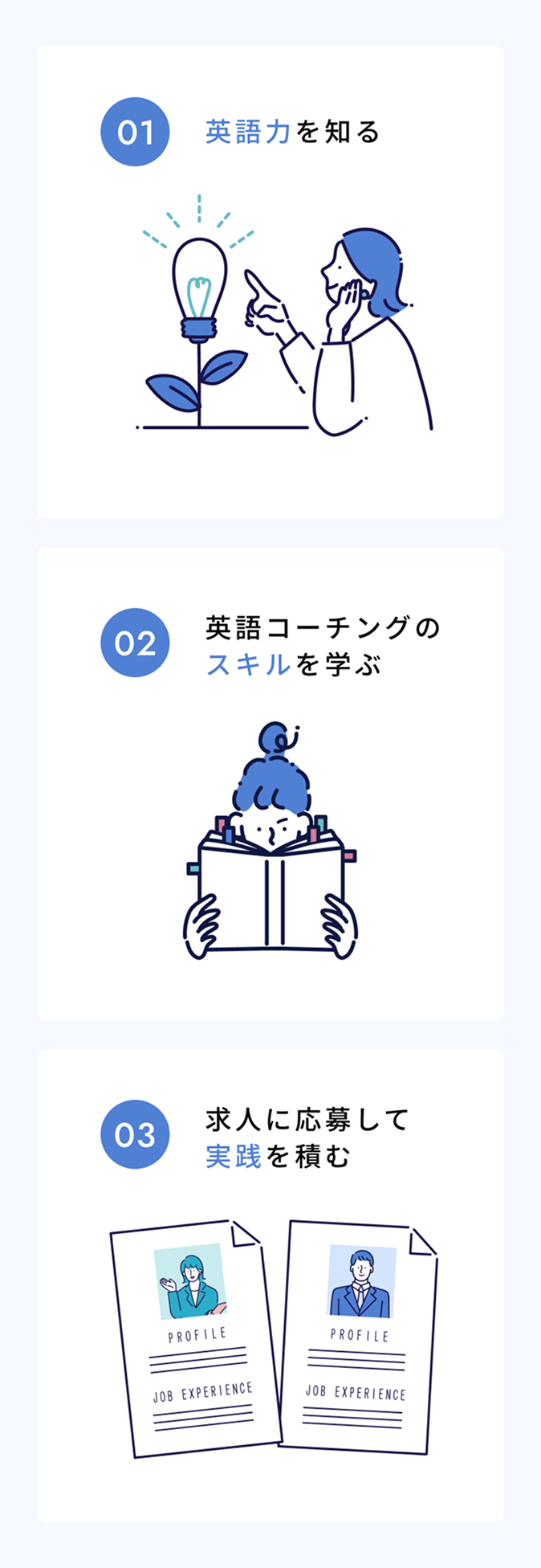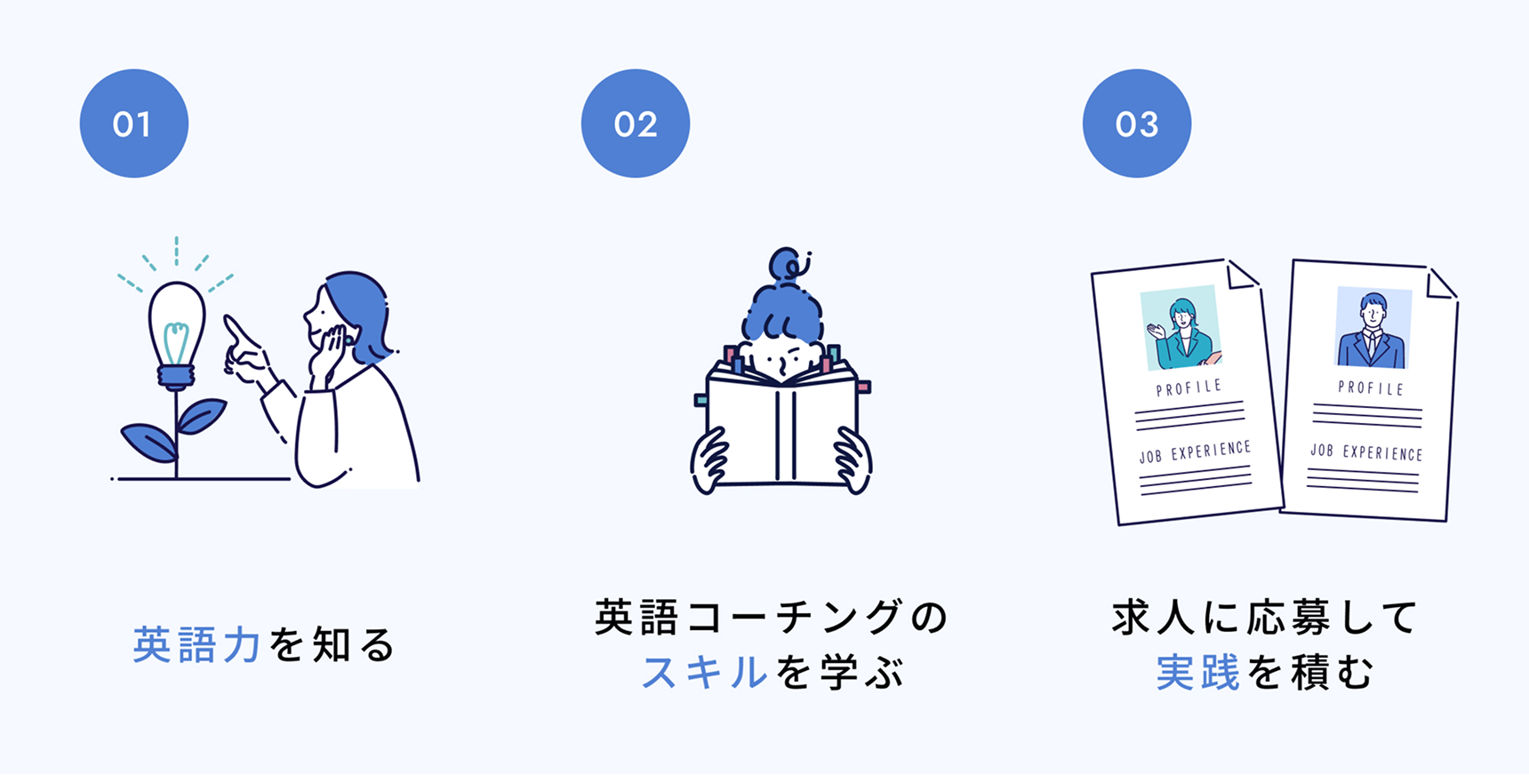 活躍できる英語コーチになるためには大きく分けて3つのSTEPがあります。①自分の英語力を知る ②英語コーチングのスキルを学ぶ ③実践練習を行う。英語コーチには、英語力だけでなく、学習者を導くためのスキルも求められます。そのため、実践を始める前に、英語コーチングの全体像を体系的に学ぶことが大切です。また、英語コーチとして活動する準備として、自分の現在の英語力を把握しておくことも重要です。TOEICなどの資格試験を受講しておくと、自分が提供できる英語コーチングの方向性を明確にできます。